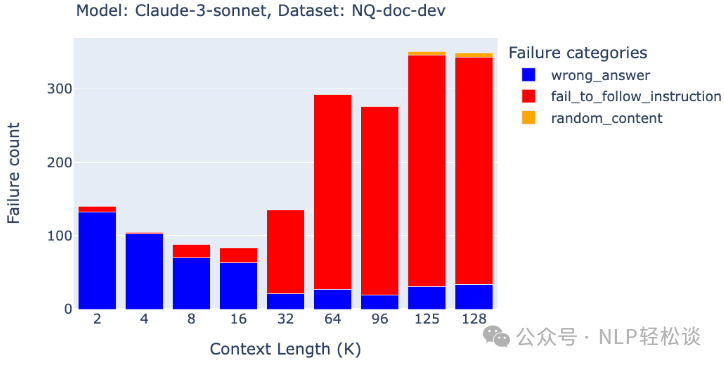 不同模型在长上下文下的失败方式也各不相同:本文深入研究了 Llama-3.1-405b、GPT-4、Claude-3-sonnet、DBRX 和 Mixtral,发现它们在长上下文场景下出现的失败模式各有特点,如因版权问题拒绝处理或始终生成上下文摘要。这些现象表明,许多模型在长上下文的训练方面尚显不足。