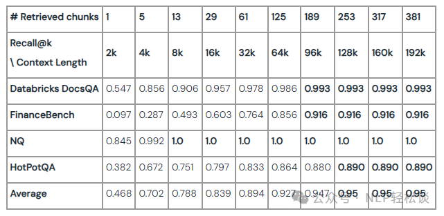 饱和点:如上表所示,每个数据集的检索召回率在不同的上下文长度下会达到饱和。例如,NQ 数据集在 8k 的上下文长度下较早达到饱和,而 DocsQA、HotpotQA 和 FinanceBench 数据集则分别在 96k 和 128k 上下文长度时达到饱和。这表明,即使使用简单的检索方法,生成模型在 96k 或 128k Token 的范围内依然能够获取额外的相关信息。因此,模型更大的上下文长度可以帮助捕获这些信息,从而提高系统的整体质量。