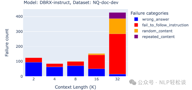 实验发现,claude-3-sonnet 和 DBRX-instruct 的失败模式特别引人注目,因为这些失败模式在达到一定的上下文长度后变得更加明显。例如,Claude-3-sonnet 的版权问题失败率在 16k 上下文长度时为 3.7%,在 32k 时增加到 21%,在 64k 时进一步增加到 49.5%;DBRX 的指令跟随失败率在 8k 上下文长度时为 5.2%,在 16k 时上升到 17.6%,在 32k 时达到了 50.4%。这些问题可能是由于长上下文长度下缺乏足够的指令跟随训练数据导致的。类似的观察结果也出现在 LongAlign 论文(Bai 等,2024)中,该论文表明,更多的长指令数据可以提高长任务的性能,而长指令数据的多样性有助于模型的指令跟随能力。