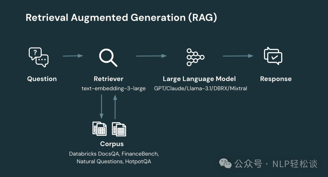 在本研究中,对所有大语言模型 (LLM) 在 4 个经过精心筛选的 RAG 数据集上进行了基准测试。这些数据集包括了行业应用场景的 Databricks DocsQA 和 FinanceBench,以及更具学术性的 Natural Questions (NQ) 和 HotPotQA。