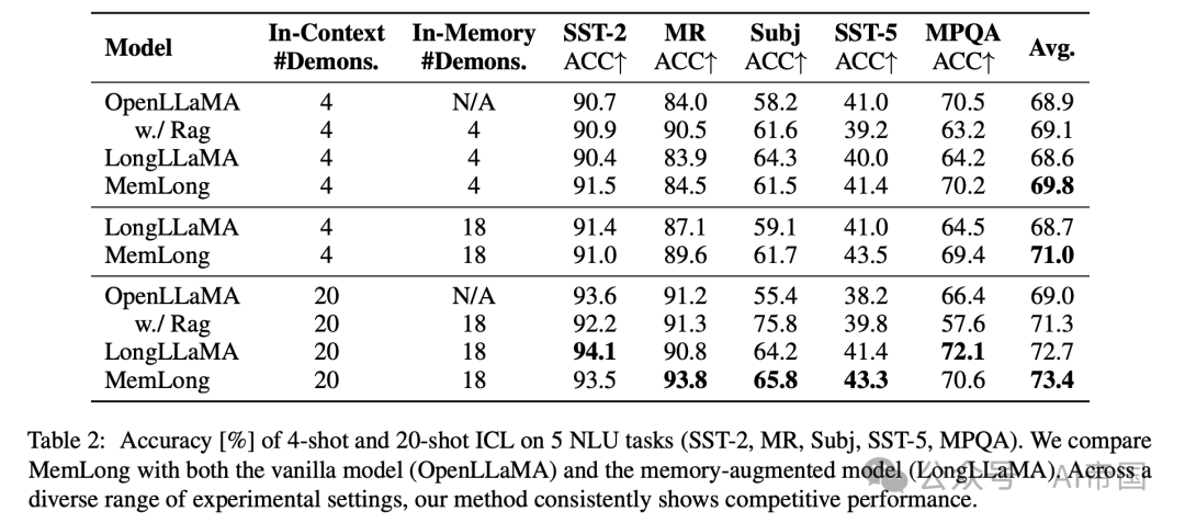 传统的上下文学习(ICL)将少量的非参数化示例与查询一同输入模型。然而,这些方法通常受限于模型的输入长度。在本实验中,由于MemLong可以将示例以参数化形式存储在其记忆中,论文主要研究MemLong是否能有效利用其记忆中存储的知识以增强其突现能力。结果如表2所示。