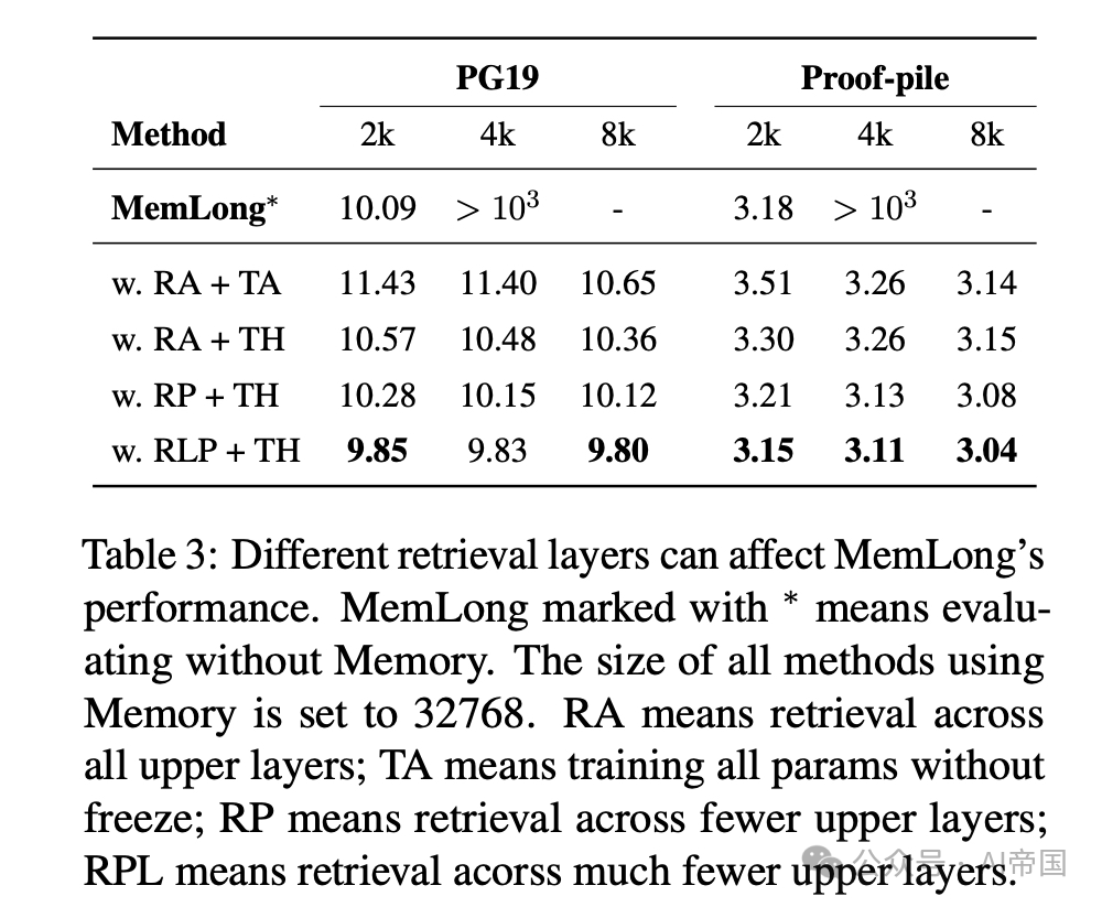 表3:不同的检索层会影响MemLong的性能。token为的MemLong表示在没有Memory的情况下进行评估。所有使用Memory的方法的大小设置为32768。RA表示跨所有上层检索;TA表示不冻结参数的训练;RP表示跨较少上层检索,RPL表示跨更少上层检索。