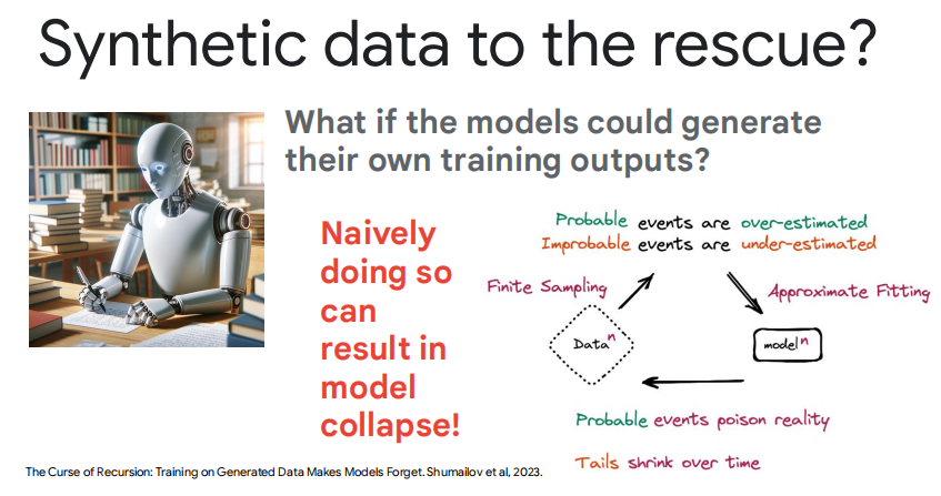 当前 LLM 训练面临的一个关键挑战: 高质量训练数据的稀缺,传统方法依赖从网络抓取或人工收集高质量数据,这种方式既耗时又昂贵,难以扩展,特别是对于复杂任务而言。  为解决这一问题,演讲者提出了一个创新性的想法: 让模型自己生成训练数据。但这里存在一个潜在的问题: 如果简单地让模型生成数据并用于训练,可能会导致 "模型崩溃"。  ReST_EM算法介绍了一种称为 ReST_EM (Reinforcement Self-Training via Expectation-Maximization) 的算法来解决这个问题: - E-step:从模型生成样本,并使用二元反馈进行筛选。