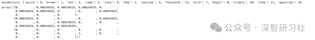 tfidf = TfidfVectorizer()tfidf_matrix = tfidf.fit_transform(preprocessed_text)print("Vocabulary:", tfidf.vocabulary_)tfidf_matrix.toarray()