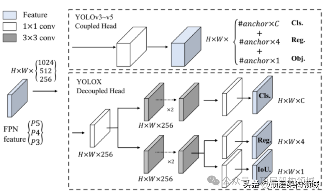 YOLOX 在 YOLO 系列算法中具有一些独特之处,例如解耦头设计,它包含一个 1×1 的卷积层以调整通道数,然后是两个并行分支,每个分支上包含两个卷积层。这两个分支分别用于分类和回归任务,这样的设计使得 YOLOX 在训练时能更快地收敛。