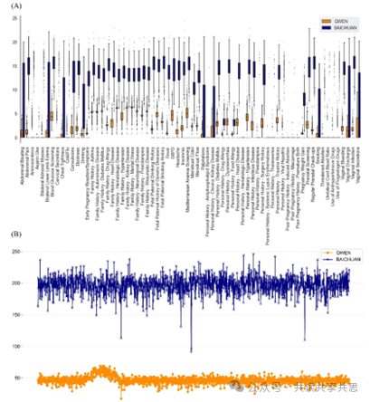 图 2A 比较了 LLM 在提取不同概念时所消耗的时间。尽管不同概念之间存在显著差异,但总体而言,LLM 在这些概念上表现出一致的性能。对于定义清晰、语料库简洁的查询,例如药物使用和既往妊娠史,所消耗的时间最少。在病历类别中,两种模型均表现出均匀稳定的性能 (QWEN 和 BAICHUAN 均显示 1:3 的时间消耗比)。