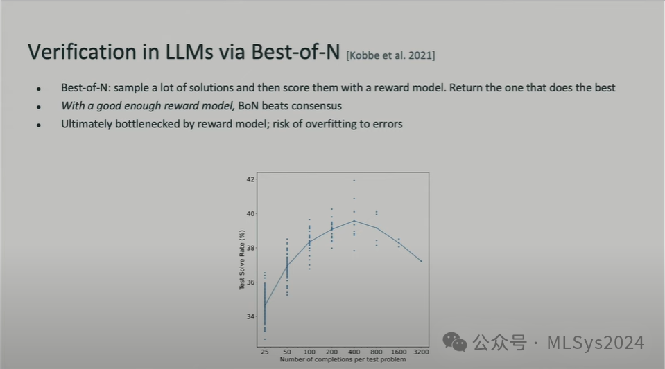 还有另一种方法是“最佳n”。想法是有一个奖励模型来评估生成结果的质量,而不是返回第一个结果,而是生成n个方案,然后返回奖励模型认为最好的那个。若奖励模型足够好,“最佳n”会优于共识,但其瓶颈在于奖励模型的质量。若奖励模型不佳,会出现过拟合,表现可能比共识差。这个方法在有明确正确答案的领域很有用,如国际象棋或数独。