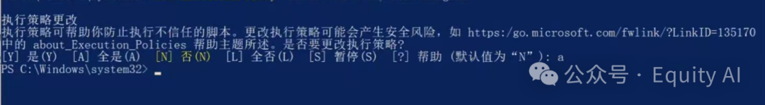 第一次执行会弹出以下窗口,会出现执行策略更改确认时,输入A后按回车确认,关闭运行窗口