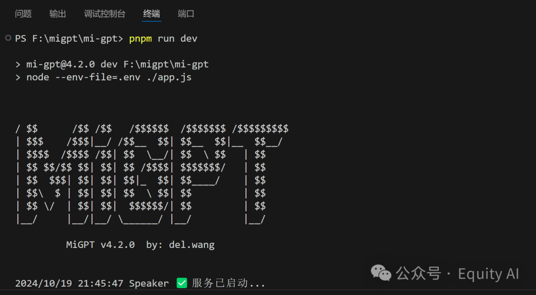 1. 每次需要打开服务时,按照下图方式进入终端,先输入cd mi-gpt ,再运行 pnpm run dev 即可打开服务