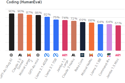 - Jamba 1.5 Mini:轻量级的设计使其在移动和嵌入式设备上表现出色。