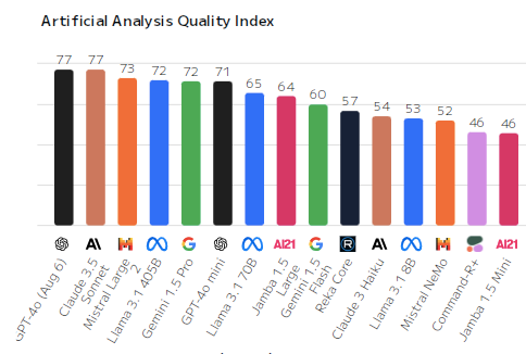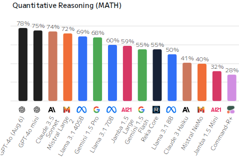 我们可以看出,在处理数学问题和定量分析方面,来自于 OpenAI 的 GPT-4o(Aug 6)和GPT-4o mini 则占据了第一第二名的位置。