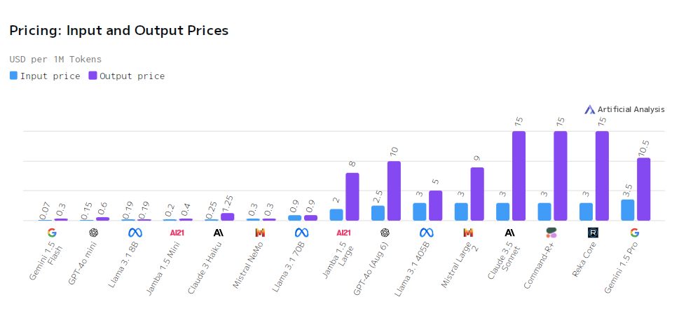 最后一个,可能的对于你们团队来说也比较关键,你需要考虑大语言模型的使用成本。这张图分别列出了 15 个 大语言模型的输入、输出价格对比,权衡之后做出你的选择即可。