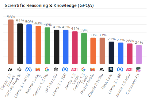 我们可以看出,在科学领域内的推理和知识应用方面,Claude 3.5 Sonnet 和 GPT-4o (Aug 6)依旧表现得很出众,取得了前两名的好成绩。