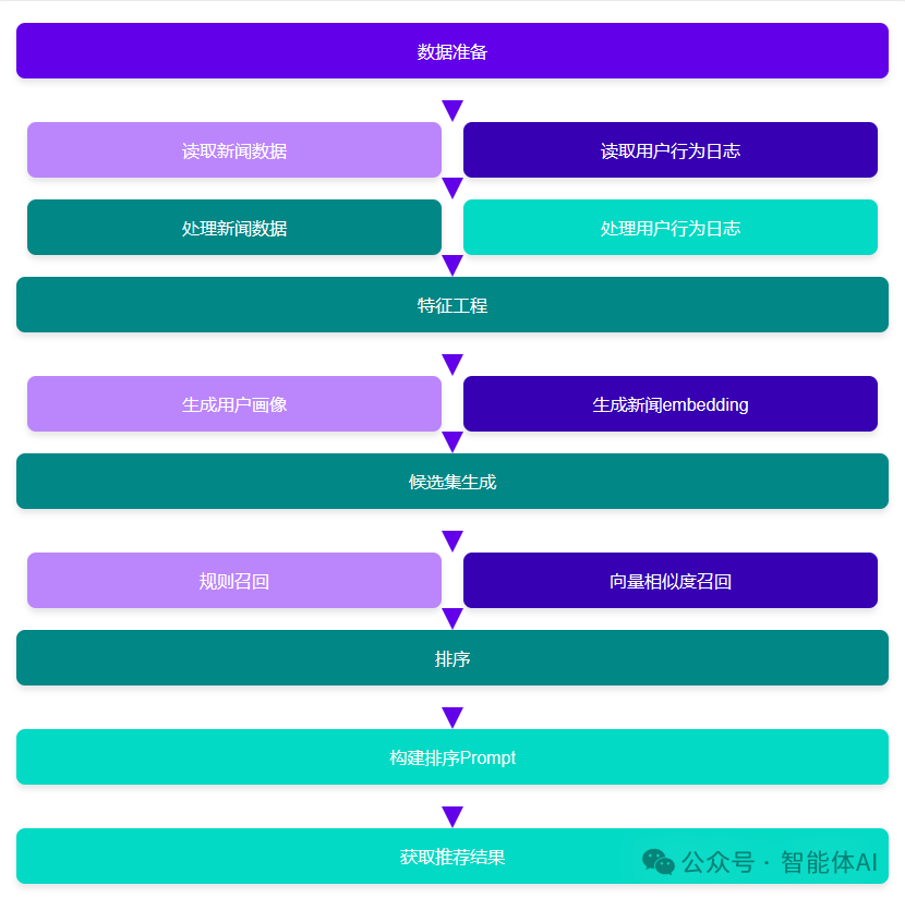 对新闻文章进行标签化,并将新闻内容和标签向量化存储。 通过用户画像,捕捉用户的阅读历史和行为习惯,如点赞、收藏、点击的文章等。 根据用户画像和行为在文章库中进行初步搜索(召回)。 对召回结果进行精排,考虑用户兴趣变化、文章来源、时效性等因素。 输出Top 10的个性化推荐文章。
