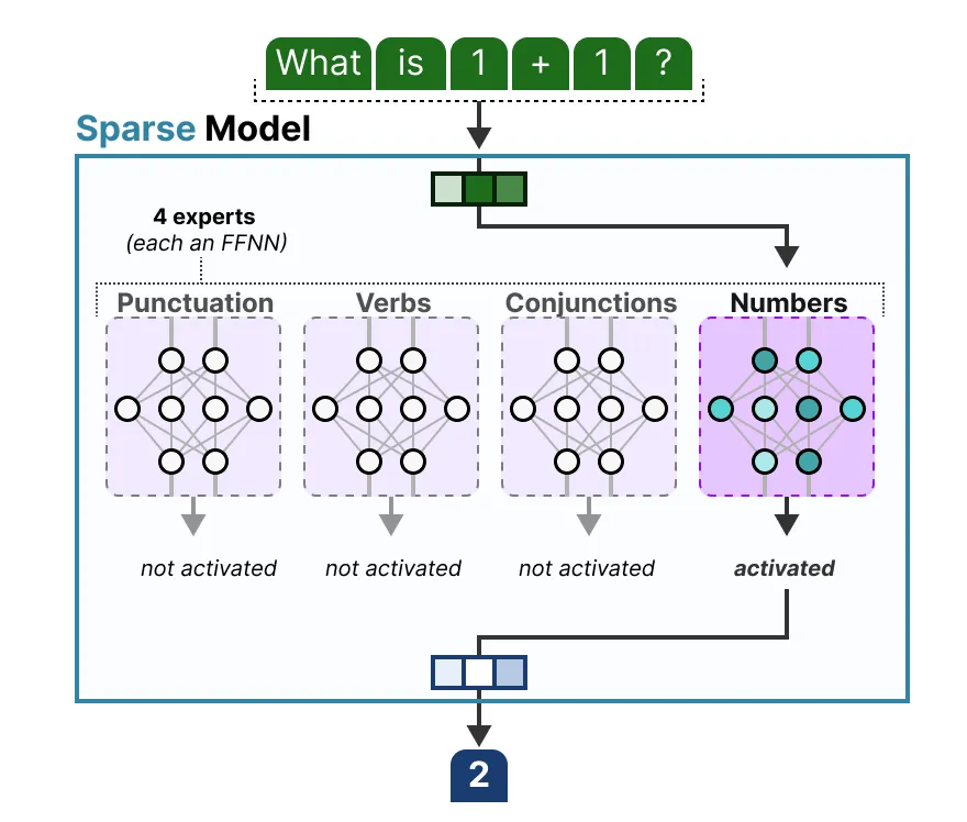 其核心思想是,每个专家在训练过程中学习不同的信息。而在推理时,仅使用与当前任务最相关的特定专家。
