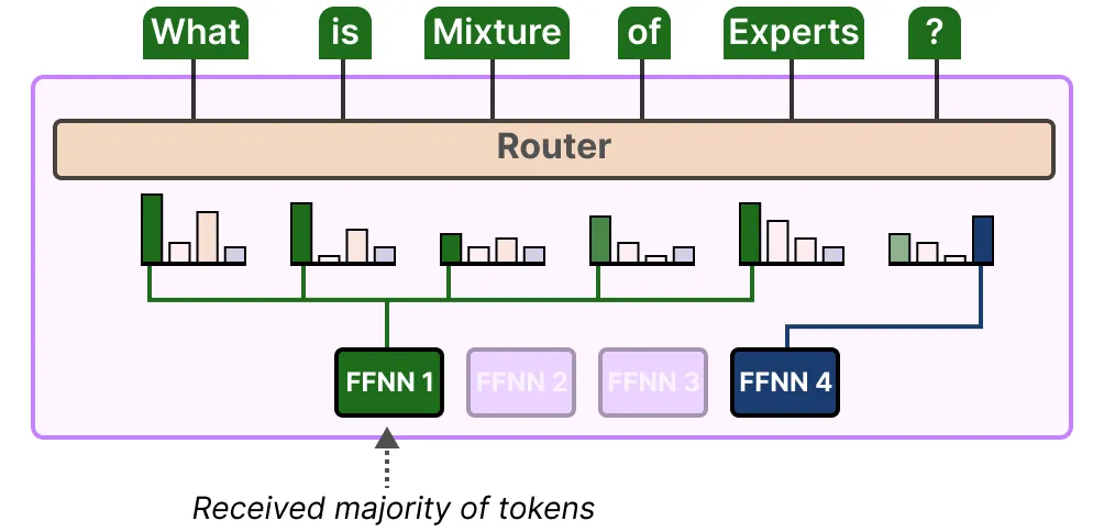 • 专家(Experts):每个前馈神经网络层(FFNN)现在都有一组可以选择的“专家”。这些“专家”通常本身也是前馈神经网络(FFNN)。