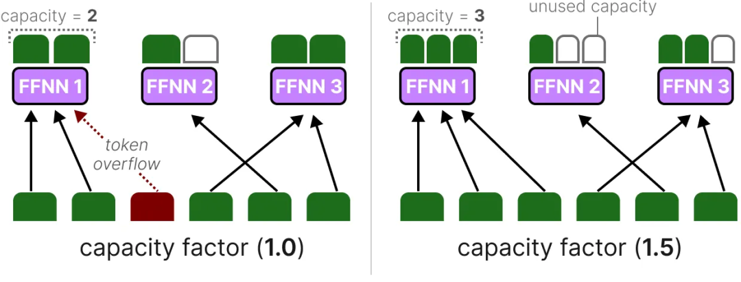 然而,如果容量因子过大,就会浪费计算资源。相反,如果容量因子过小,模型性能会因为 token 溢出而下降。