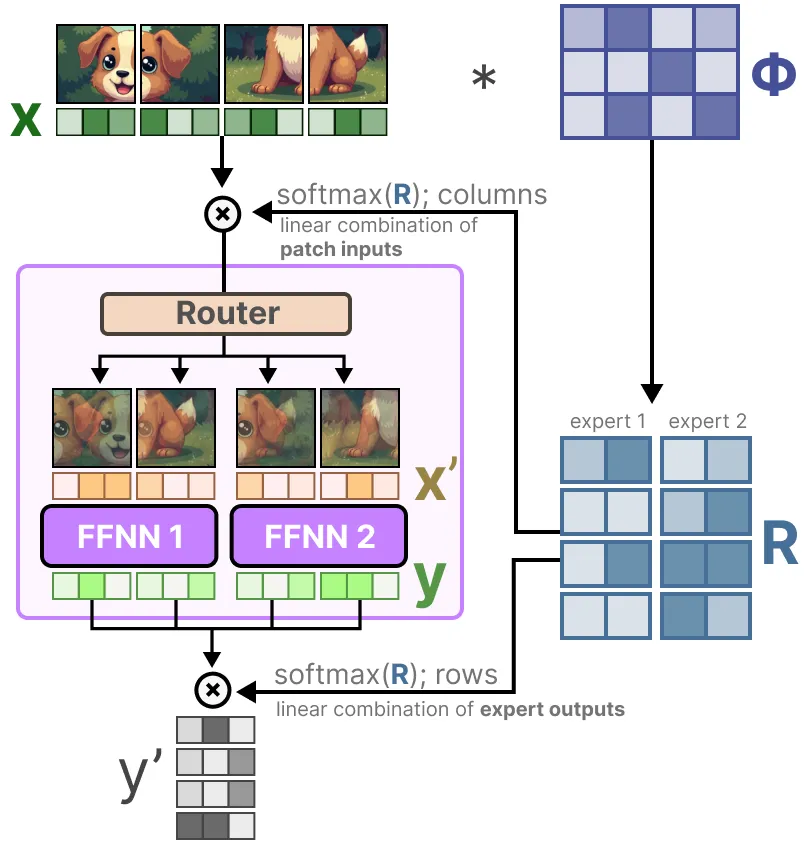 从视觉上看,这就像是所有图像块被混合。这些组合后的图像块被发送到每个专家。生成输出后,它们再次与路由矩阵相乘。
