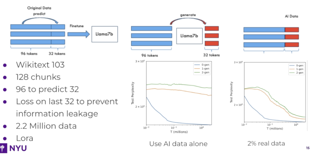 0-gen(蓝线)困惑度test perplexity最低,模型的预测表现最好,因为它使用了原始的真实数据进行训练。1-gen和2-gen曲线(橙线和绿线)表现较差,困惑度较高,说明当模型大量依赖自己生成的数据时,性能会逐渐下降。这是因为生成的数据可能引入噪声或偏差,降低了模型的学习效果