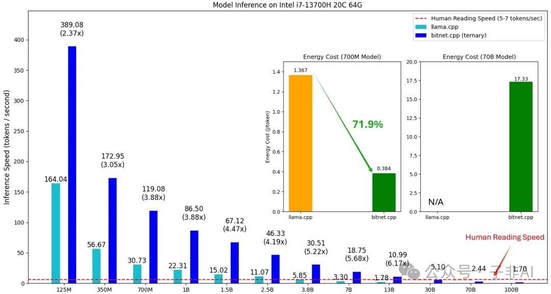 这种方式进一步提高了压缩率,减少了存储空间和读取时间,但也增加了查找表的复杂度。TL2 内核更适用于内存带宽受限的场景,因为它能最大程度地减少数据读取量。 性能评测:速度与能耗的双重提升为了评估 BitNet.cpp 的性能,研究人员在不同规模的模型(从 1.25 亿到 1000 亿参数)和不同架构的 CPU(ARM 和 x86)上进行了测试,涵盖了从小型到超大型的各种LLM模型,以及常见的CPU架构。 推理速度对比测试结果表明,BitNet.cpp 在 ARM 和 x86 架构上均实现了显著的推理速度提升,尤其是在模型规模较大的情况下。图1和图2展示了 BitNet.cpp 和 llama.cpp 在 Apple M2 和 Intel i7-13700H 芯片上运行不同规模 BitNet b1.58 模型的推理速度对比。可以看出,BitNet.cpp 的推理速度 consistently surpasses llama.cpp,尤其是在处理大型模型时,优势更加明显。 能耗对比测试结果表明,BitNet.cpp 在降低能耗方面表现出色,尤其是在模型规模较大的情况下。下表展示了 BitNet.cpp 和 llama.cpp 在 Apple M2 和 Intel i7-13700H 芯片上运行 7 亿、70 亿和 700 亿参数模型的能耗对比。可以看出,BitNet.cpp 的能耗 significantly lower than llama.cpp,尤其是在运行大型模型时,能耗优势更加突出。 | CPU | Kernel | 700M (J/token) | 7B (J/token) | 70B (J/token) | | Apple M2 | llama.cpp | 0.314 | 3.013 | 28.02 | | Apple M2 | bitnet.cpp | 0.140 | 1.068 | 8.42 | | Intel i7-13700H | llama.cpp | 1.367 | 11.305 | N/A | | Intel i7-13700H | bitnet.cpp | 0.384 | 2.017 | 17.33 |