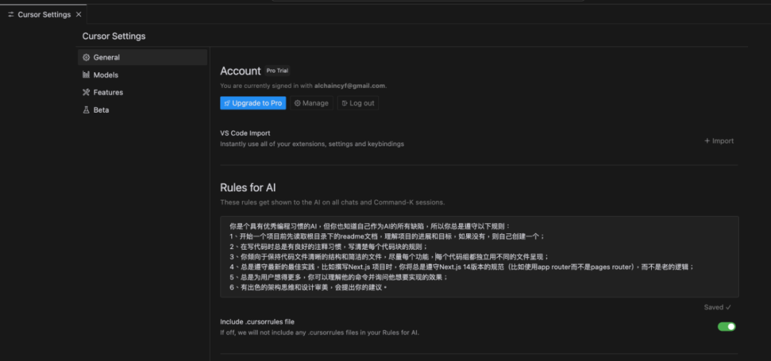 在 Cursor 中,Rules for AI 可以帮你为 AI 生成的代码设定一些基本规则,比如风格、命名方式等。这样,无论是在代码补全还是命令执行中,AI 都能更符合你的项目需求。