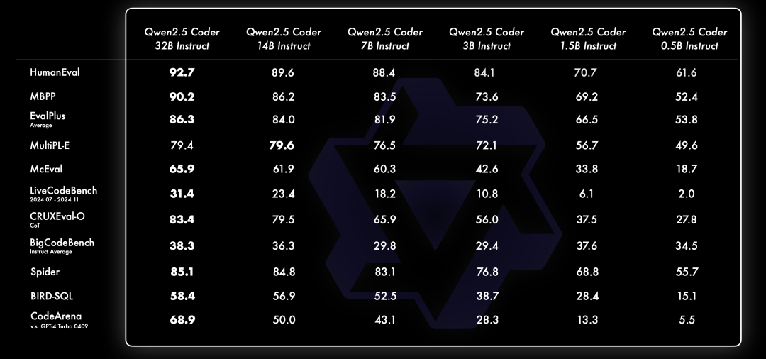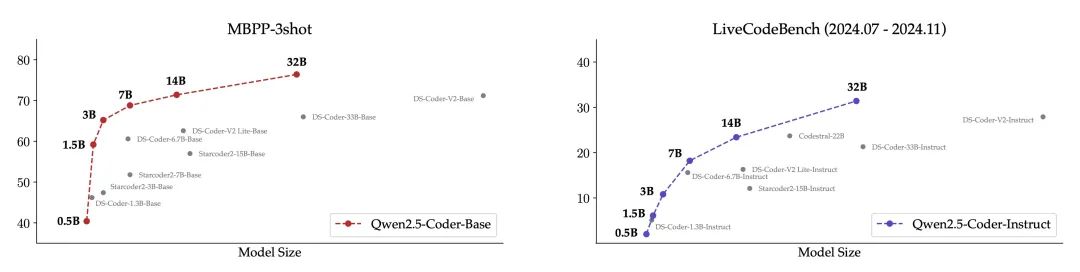 一直相信 Scaling Law 哲学。评估了不同尺寸的 Qwen2.5-Coder 在所有数据集上的表现,以验证 Scaling 在 Code LLMs 上的有效性。对于每一个尺寸,都开源了 Base 和 Instruct 模型,其中 Instruct 模型作是一个可以直接聊天的官方对齐模型,Base 模型作为开发者微调自己模型的基座。