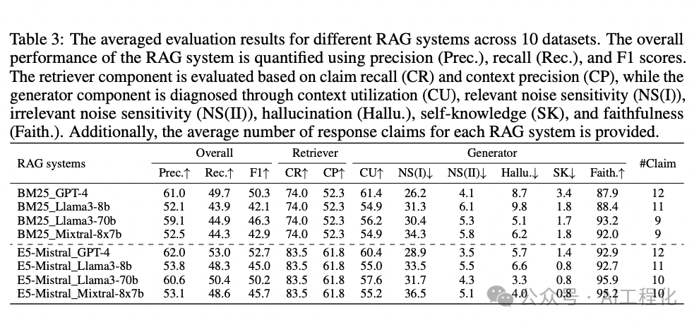 存在检索召回和生成器噪声敏感度之间的权衡。提高检索召回率会不可避免地引入更多噪声,从而增加生成器的噪声敏感度。数据显示,使用 E5-Mistral 检索器时,声明召回率从 74.0%提高到 83.5%,但相关噪声敏感度也从 26.2%上升到 28.9%。