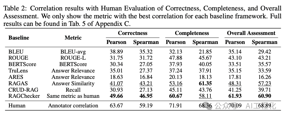 RAGChecker 的有效性已通过大规模实验和人工评估得到验证。结果显示,RAGChecker 的评分与人类判断的相关性显著高于现有评估方法。在 Pearson 相关性上,RAGChecker 达到了 61.93%,而最接近的基线方法 RAGAS 仅为 48.31%。