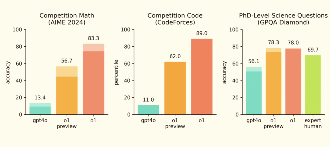 发布会上,Sam Altman 再次以模型解决数学竞赛题、编程竞赛题和博士级别的科学问题的能力,来展现新模型的水平。