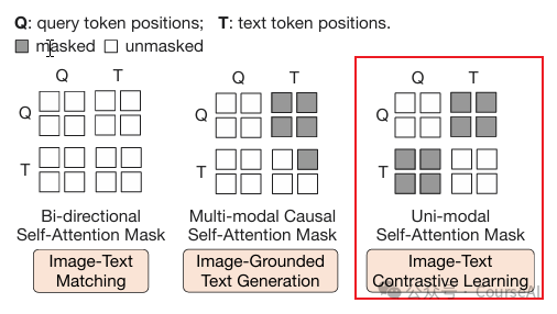 1. 视觉-语言桥接训练阶段Image-Text Contrastive Learning (ITC)图像-文本对比学习 目的:通过最大化图像表示和文本表示的互信息来实现它们的对齐,即通过对比正对(匹配的图像-文本对)和负对(不匹配的对)之间的图像-文本相似度来实现这一目标 方法:为了避免信息泄漏,使用单模态自注意力掩码,使得query和text不能看到彼此。text经过text transformer输出的[CLS]的token embeding【这里的CLS被记为符号t】与query经过imge transformer输出的向量Z【Z表示一个batch内的所有query】进行对齐。 计算Z与t两两相似度,选择最高的相似度作为图-文相似度。 Image-grounded Text Generation (ITG) 图像支持文本生成 目的:以输入图像作为条件生成文本,来训练Q-Former 方法:由于Q-Former的架构不允许冻结的图像编码器和text tokens直接交互,所以生成文本所需的信息必须首先抽取来自query中的信息,然后通过自注意力层传递给text tokens。因此,query被迫提取能捕获所有文本信息的视觉特征。所以采用本文采用多模态因果自注意力掩码来控制query-text之间的交互。该掩码方式,允许batch内的query之间交互,但是不允许query与text之间交互;text允许与所有的的query交互,也能与自身前面的token交互。同时本文用[DEC]代替[CLS]作为text的第一个token,也作为decoding task 解码任务的标志。 Image-Text Matching (ITM) 图像-文本匹配 目的:学习图像和文本表示之间的精细对齐,是一个二分类任务,模型需要预测图像-文本对是正对(匹配)还是负对(不匹配)。 方法:使用双向自注意力掩码,允许所有query和text之间的交互。因此,query输出的嵌入Z,捕获了多模态信息, 将Z送入到2分类的线性层得到logit,然后对所有query输出的logit取平均作为输出匹配分数。 2. 视觉-语言生成训练阶段 在生成预训练阶段,将 Q-Former连接到冻结的 LLM,以利用 LLM 生成文本。这里使用全连接层将输出的Query嵌入线性投影到与 LLM 的文本嵌入相同的维度,然后将投影后的Query的embedding 添加到输入的text的embedding 前面。由于 Q-Former 已经过预训练,可以提取包含语言信息的视觉表示,因此它可以有效地充当信息瓶颈,将最有用的信息提供给 LLM,同时删除不相关的视觉信息,减轻了 LLM 学习视觉语言对齐的负担,从而缓解了灾难性遗忘问题。 |