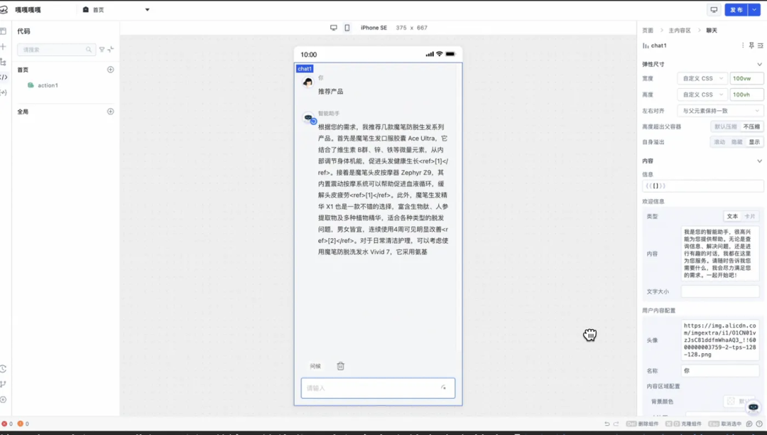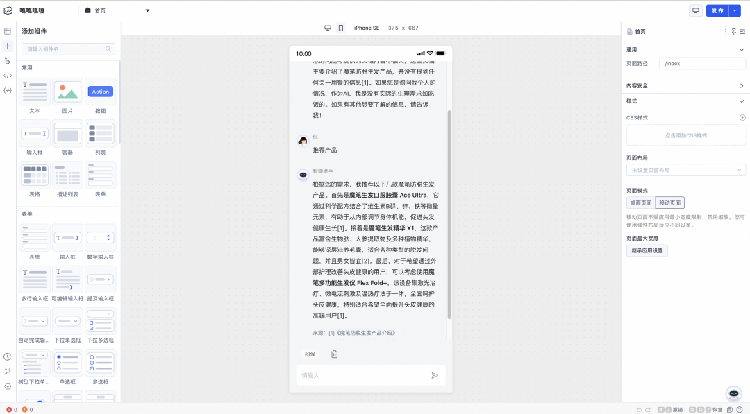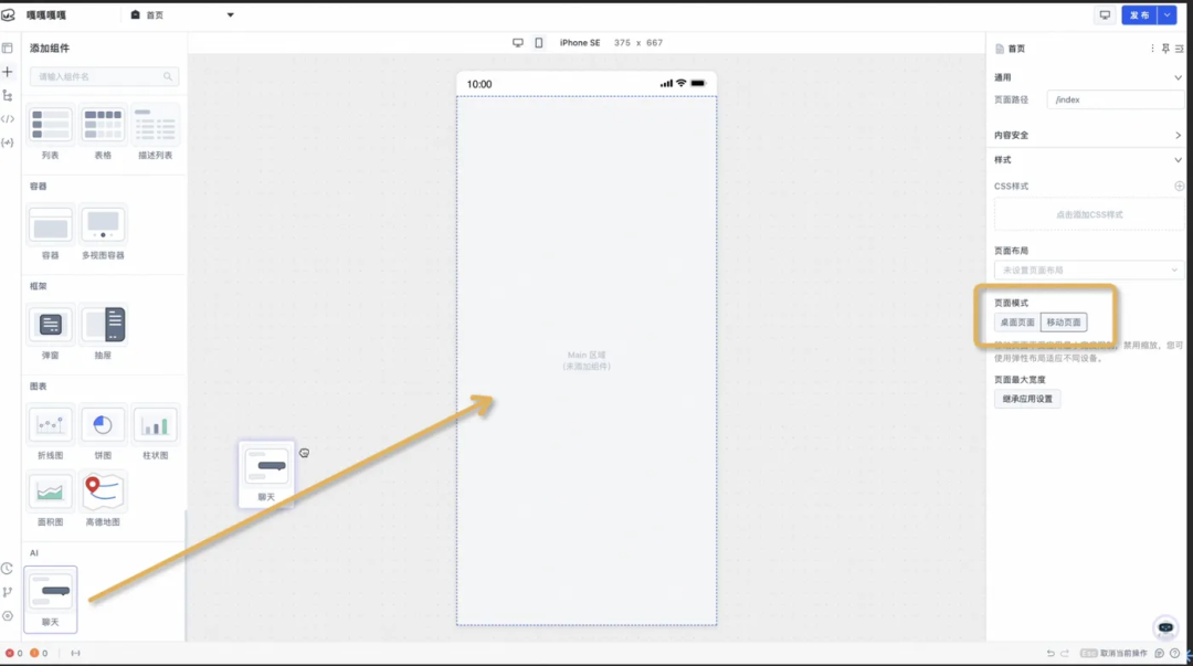 至此,我们完成了百炼 RAG 智能体应用在魔笔应用中的集成引用,下一步我们将基于集成操作和魔笔平台预制的系统组件来设计和搭建一个聊天前端 UI 界面。 ChatUI定制魔笔平台提供的可视化搭建设计器,可以轻轻松松快速构建简洁的前端 UI。我们将页面类型切换为移动端模式,并在设计器中直接拖入一个聊天组件: