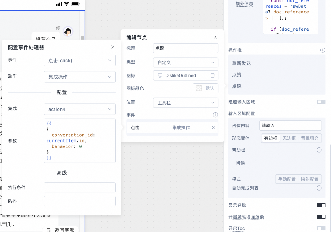 INSERTINTObehavior(user_id,conversation_id,behavior)VALUES({{mobi.currentUser.id}},{{conversation_id}},{{behavior}})然后,我们将上一步中创建的集成操作与组件进行关联,来完成持久化数据的写入: 首先需要分别在聊天会话发送完成和回答完成阶段,触发「插入会话」的集成操作,将一轮对话会话数据落库。主要搭建思路如下,我们需要分别在「发送内容」和「回答完成」两个事件阶段来完成集成操作的触发,因此我们可以采取组件提供的事件响应机制[19]来完成这两个事件处理器[20]的绑定: