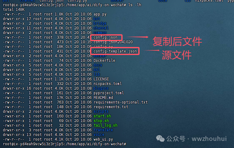 3.相关配置文件 以上步骤我们完成了docker 镜像下载,接下来我们设置一下程序配置文件。 cd /home/app/ai/dify-on-wechat cd /home/dify-on-wechat 进入dify-on-wechat 目录下,我们会看到有一个config-template.json,我们打开它 { "dify_api_base": "https://api.dify.ai/v1", "dify_api_key": "app-xxx", "dify_app_type": "chatbot", "channel_type": "wx", "model": "dify", "single_chat_prefix": [""], "single_chat_reply_prefix": "", "group_chat_prefix": ["@bot"], "group_name_white_list": ["ALL_GROUP"], "image_recognition": true, "speech_recognition": true, "voice_reply_voice": true, "voice_to_text": "dify", "text_to_voice": "dify" }