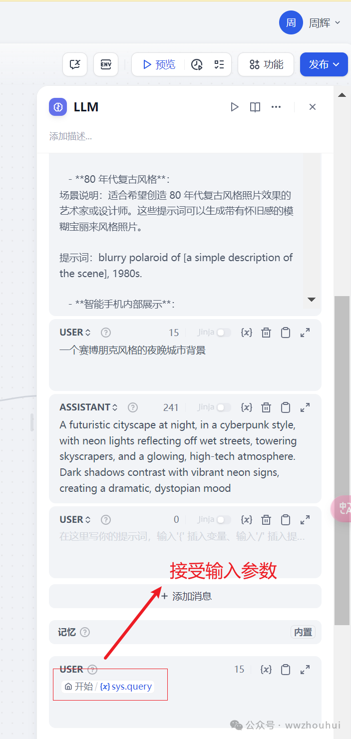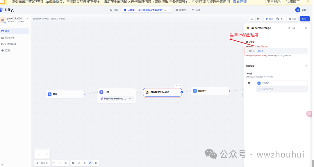 和大语言模型连接。输入变量是上一个流程节点输出。