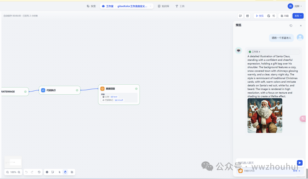 代码执行器处理代码如下: defmain(arg1:str)->str: importjson data=json.loads(arg1) filename=data['filename'] url=data['etag'] markdown_result=f"" return{"result":markdown_result} 3.4.6 直接回复这块很好理解就是上面流程中所有处理结束后,给用户输出的内容,这里我们需要输出2个东西,一个是llm大语言模型转换生成的提示词,一个是生成的图片。这里我们为什么需要输出llm大语言模型转换生成的提示词呢?主要是方便输出的提示词也可以复制到其他文生图模型中,可以对比其他模型输出效果。