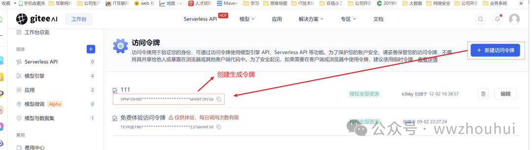 点击访问令牌创建,点击右上角”新建访问令牌”,弹出的对话框中输入名称,点击“确定” 按钮系统自动创建令牌。