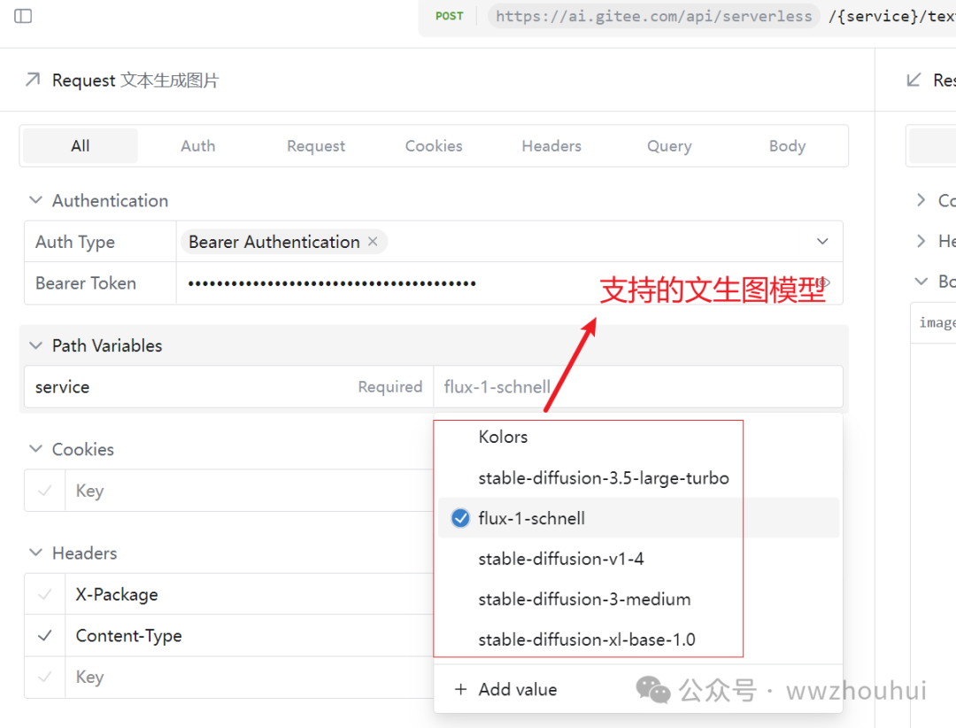 点击右边的复制按钮保存好令牌,后面的请求接口代码会用到。 3.2 Gitee AI 接口开发这里我们需要到gitee api 接口文档中查看具体开发哪个模型API文档,接口文档地址:https://ai.gitee.com/docs/getting-started/intro 我这里就以图生图的使用接口文档为案例简单介绍一下gitee Serverless API 接口开发,打开接口文档,选到文生图的接口文档中
