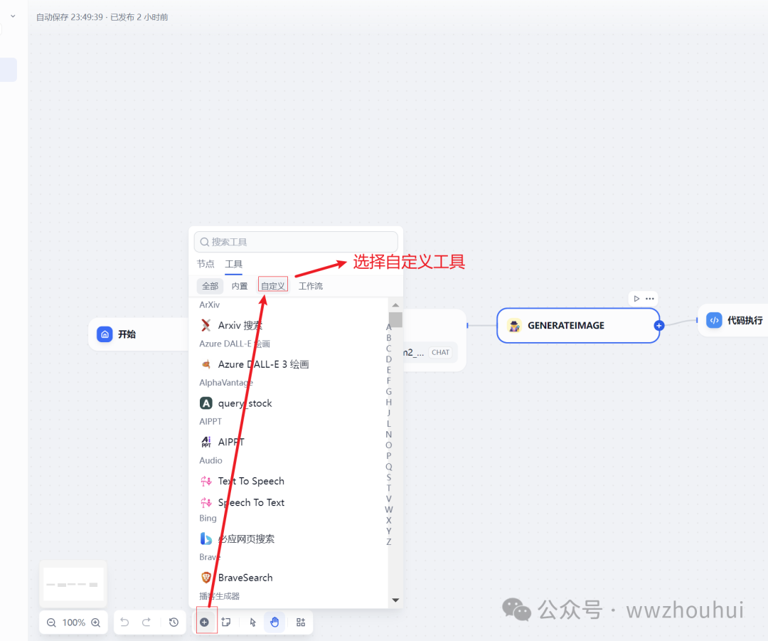 3.4.5 代码执行这个我们需要代码执行处理一下自定义工具返回的数据,输入参数是generateImage 文本输出
