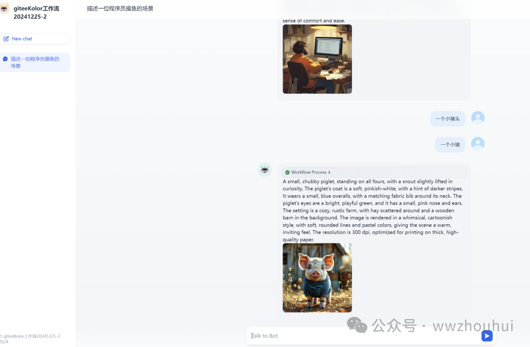 我们@小灰灰 这样绘画机器人收到消息后转发给dify 然后也同样给群里面返回生成的绘画了。 5.总结本次文章我们使用了Gitee AI+dify-on-wechat这个开源软件+dify 实现了微信绘画机器人的功能了。整体来说整合还是比较简单的,这里需要大家准备一台服务器部署dify以及dify-on-wechat 另外再提供一个微信小号,这样就可以提供7*24小时使用了。本期文章就分享到这里,感兴趣的小伙伴可以一键三连噢,我们下个文章见。 |
