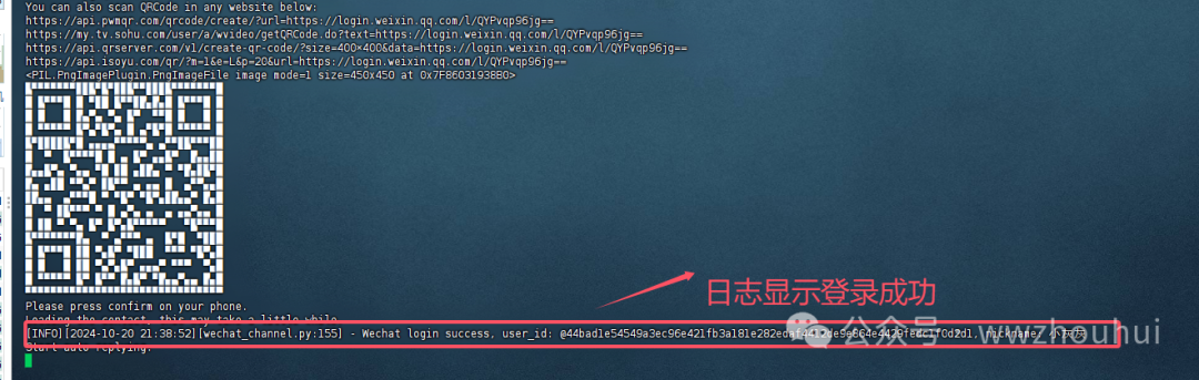 我们看到日志显示微信二维码了,我们使用微信扫码这个二维码登录(建议大家使用微信小号,这个小号登录后就充当了绘画机器人的身份) 扫完二维码后,微信弹出登录按钮,点击授权登录按钮,点击继续登录。