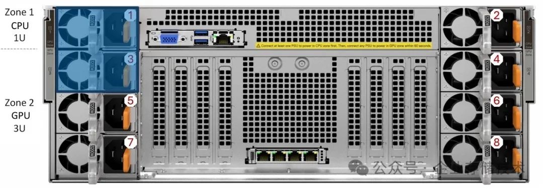 这里有一个要点:4U机箱的最上面1U部分是CPU(主板)单元;而下面3U部分是GPU模块(其中还有别的扩展卡)。上下2个Tray散热也隔离了。