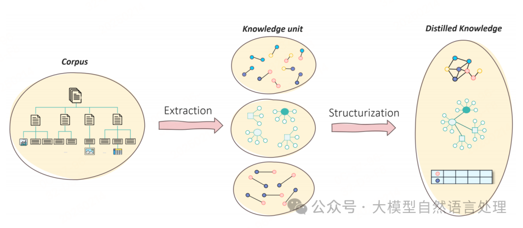 • 蒸馏知识层:将语料库进一步提炼为结构化的知识形式(如知识图、原子知识和表格知识),以支持高级推理。