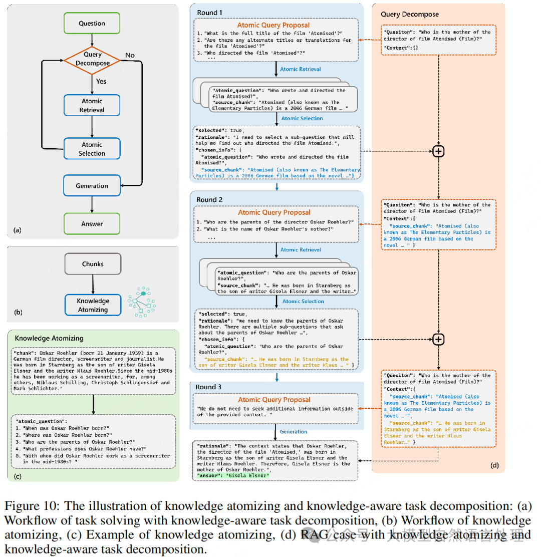 • 知识感知的任务分解:任务分解模块将复杂任务分解为更小的子任务,以提高系统的处理效率。通过生成和评估原子问题提案,动态调整检索和推理过程。