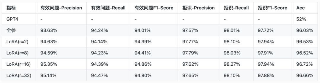 LoRA现已在业界广泛应用于各个场景的微调任务,在诸多任务中都被验证是有效且可行的。我们也基于两个业务场景做了单一任务的微调实践。LoRA的原理在于增量矩阵ΔW 满足低秩假设, h=(W+ΔW)×x中的ΔW确实是一个低秩矩阵。如果不满足该假设,那么LoRA的分解就一定会有精度损失,而达不到最好的微调效果。因此需要在任务中需要选择合适的r,理论上说,针对复杂的任务可能需要更大的r,但是r的值越大,可训练的参数量就越大,训练时长和显存占用就会同时变得更大。一般来说增大r的值会取得更好的微调效果,但是也不是一定如此,对于简单任务的微调太大的训练参数反而会使模型训练容易过拟合而导致效果变差。因此在实验阶段我们在两个NLU业务数据集上对比了全参训练、以及不同大小的r的训练效果,同时为了证明微调的效果,我们还加入了使用GPT4 zero-shot做该任务的效果对比。实验基座模型采用qwen1.5-7b-base,我们分别对比全参微调、LoRA不同r的微调以及直接使用GPT4的效果对比(业务数据集2中“有效问题”指除了标签为“其它”的数据,“拒识”指标签为“其它”的数据):