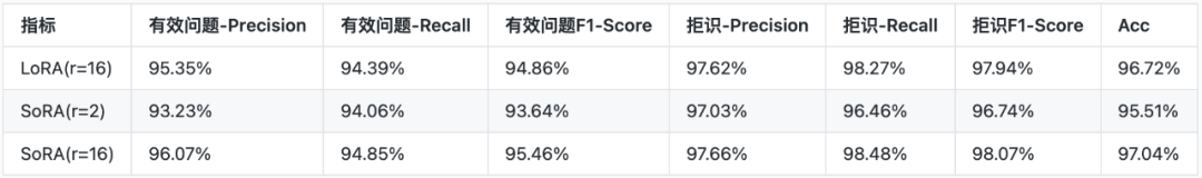 我们在2个NLU业务数据集上基于qwen1.5-7B模型对比了SoRA、AdaLoRA和LoRA微调的效果,尝试了几组超参实验,得到的实验结果显示SoRA微调在两个业务场景下都有很好效果。尤其在第二个业务场景,每个指标都取得了最好效果。