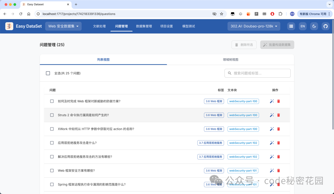 • 领域标签体系:AI 自动生成二级领域树(如「Web安全-XSS攻击」),支持手动修正,为每个 QA对绑定精准标签,降低重复率。