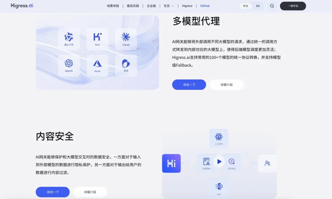 Higress.ai 目前已经提供了多模型代理、内容安全、语义缓存、令牌限流四个体验场景,通过首页顶部的导航栏就可以进行一键体验。