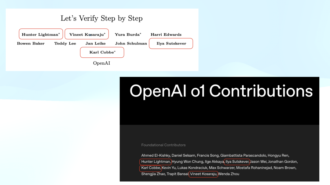o1 在发布那天公布了核心贡献者名单。而 OpenAI 在 2023 年彻底「沉默」前还发布了最后一篇论文,名为《Let’s Verify Step by Step》。这篇文章讲述了通过将一个问题逐步拆解,并对每一步进行打分进行强化学习来训练一个模型。当时,很多人在 o1 发布后回顾 OpenAI 的工作,发现去年公开的最后一篇研究论文就是这篇,后再也没有新发布的工作。