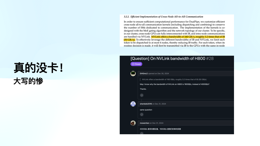 特别有意思的是,当我准备这次分享时,发现文中提到的 NVLink 速率为 160G 每秒,而不是 H800 的 400G。这让我很好奇,于是我在 GitHub 上查了一下,发现有人也提了类似的问题,问:「为什么你们的 NVLink 速率是 160G,而不是 400G。」