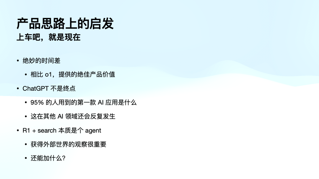 讲到这里,希望大家还记得我的本职工作是做产品的。今天我也想分享一下 R1 在产品思路上的启发。
